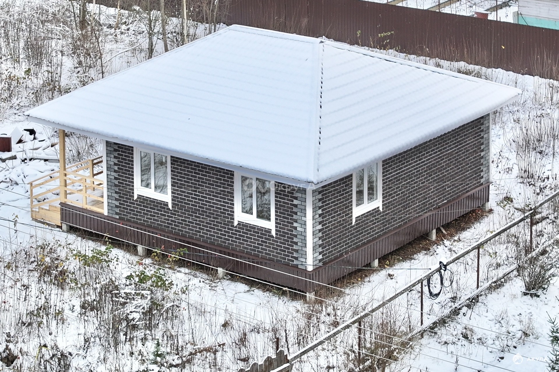 * Материал стен - усиленный каркас по технологии, фундамент - бетонные сваи с заглублением 2, 5 метра, крыша и фасад обшиты софитом высокого качества;