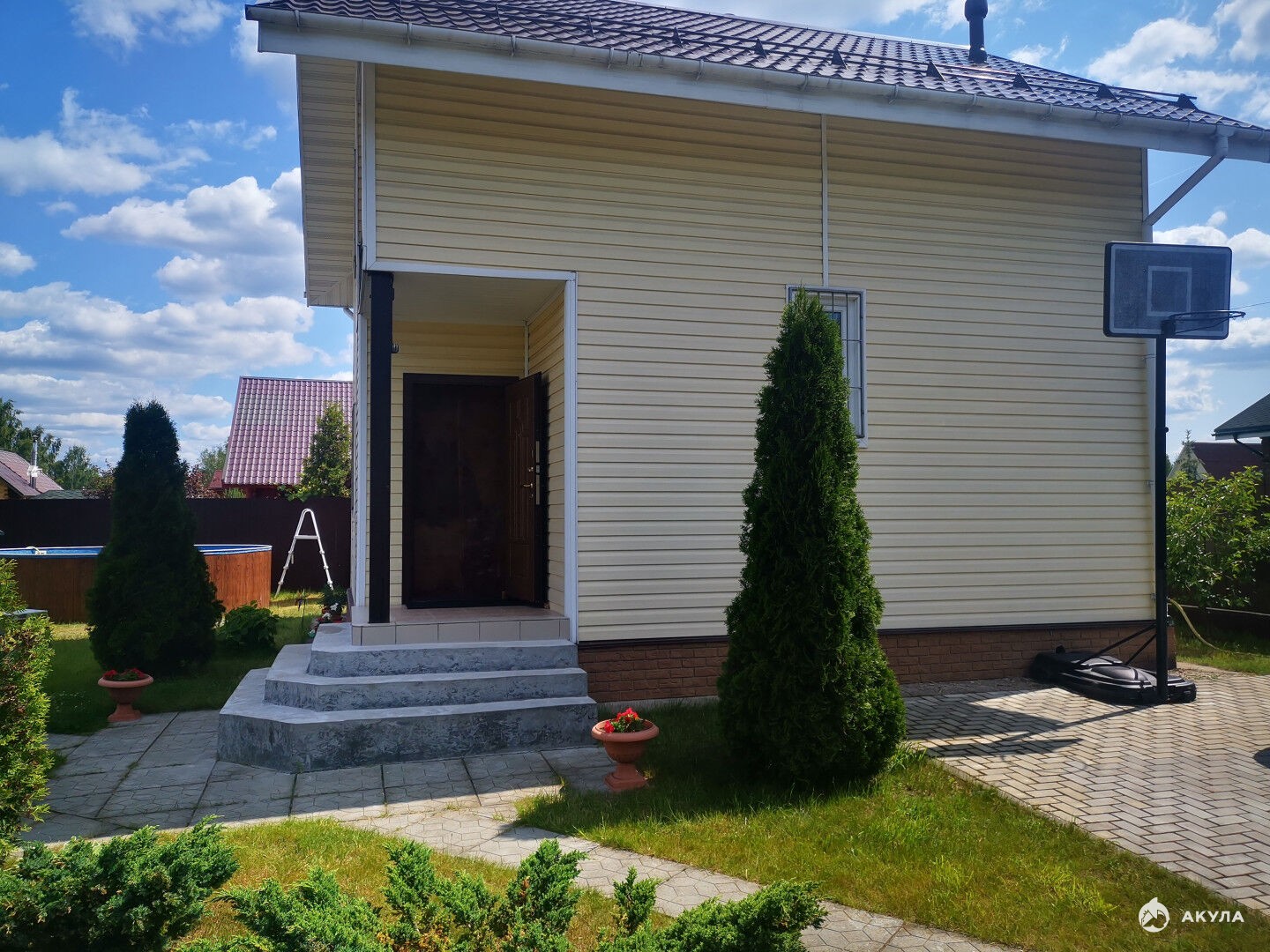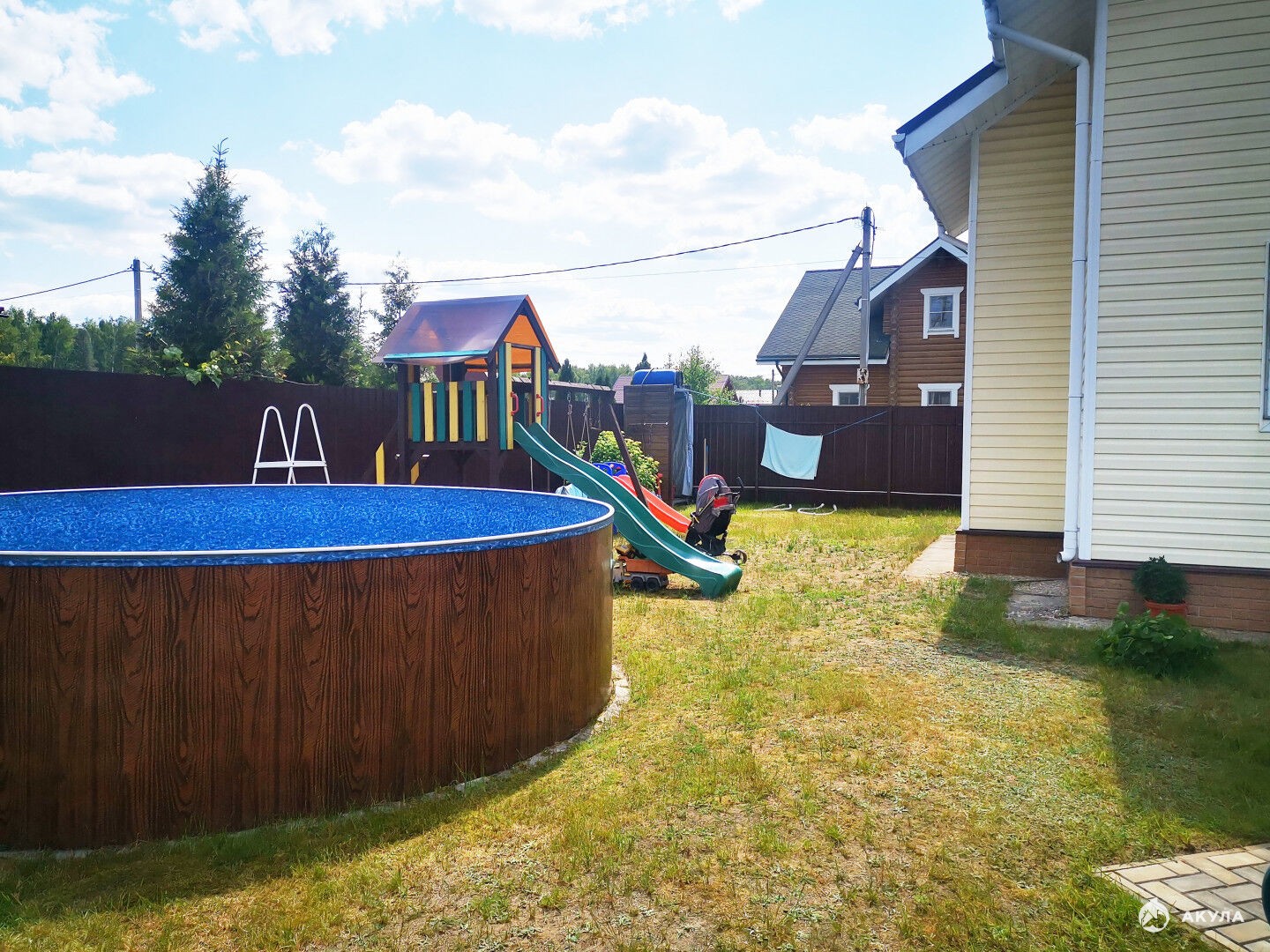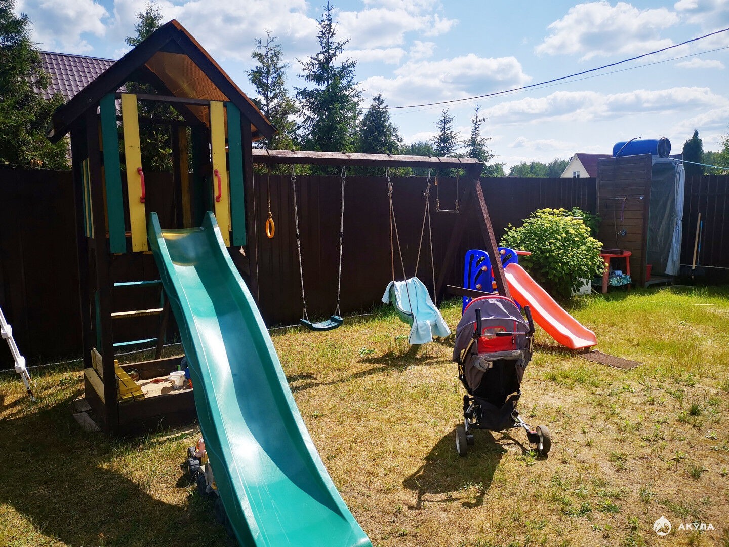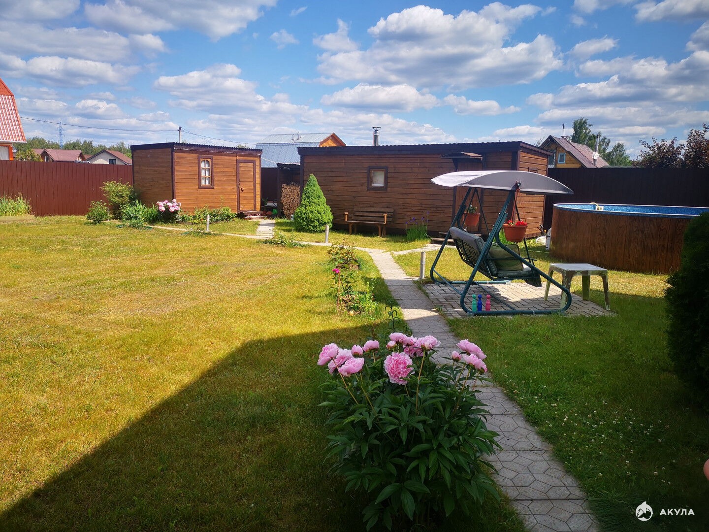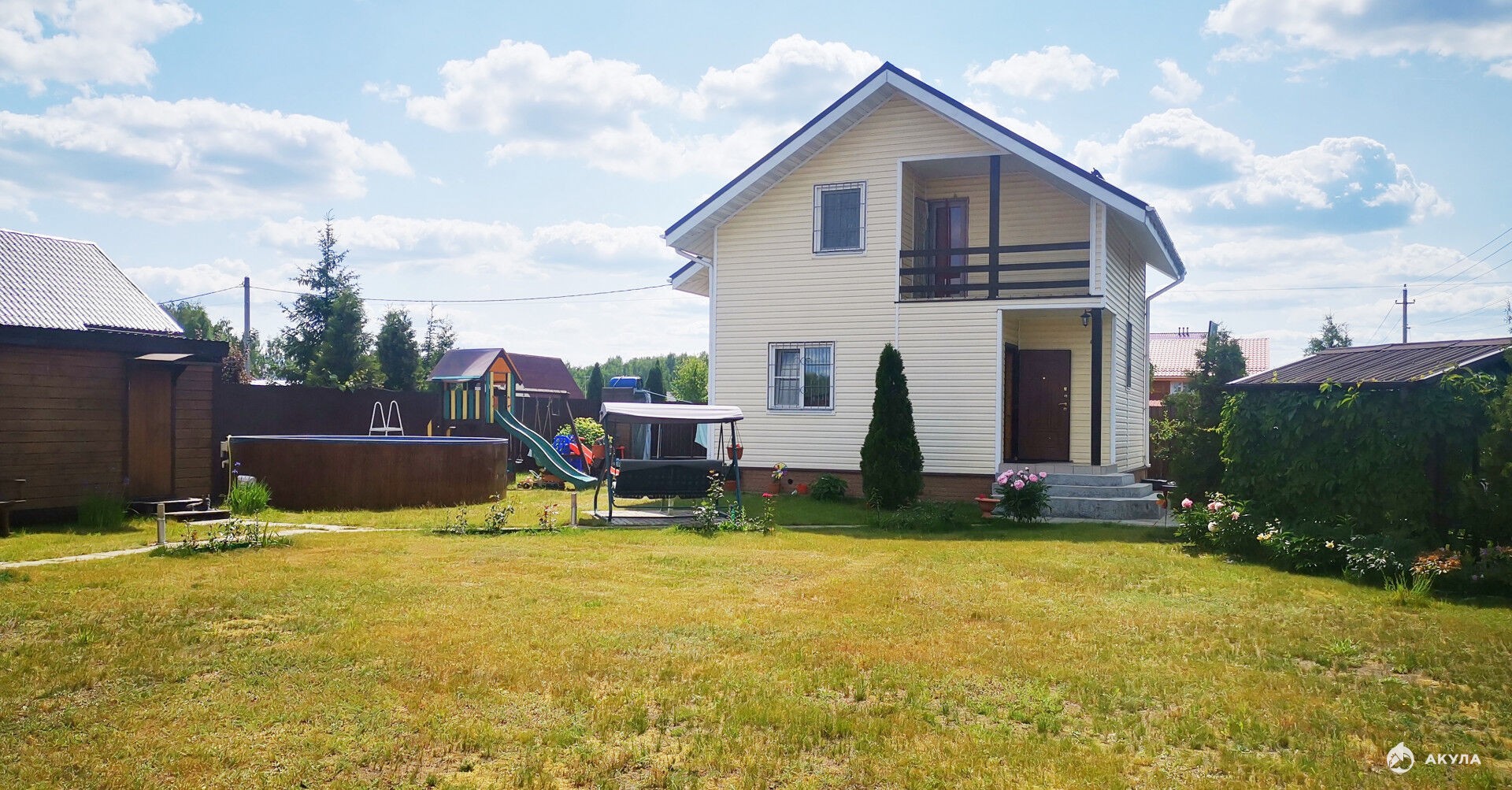 На благоустроенном участке есть отличная баня из бруса, хозблок, летний душ, теплица. Уютная беседка- барбекю с большим столом и мангалом. Детский комплекс и 2 стационарные качели, песочница, 2 горки и др. Бассейн 5 метров.