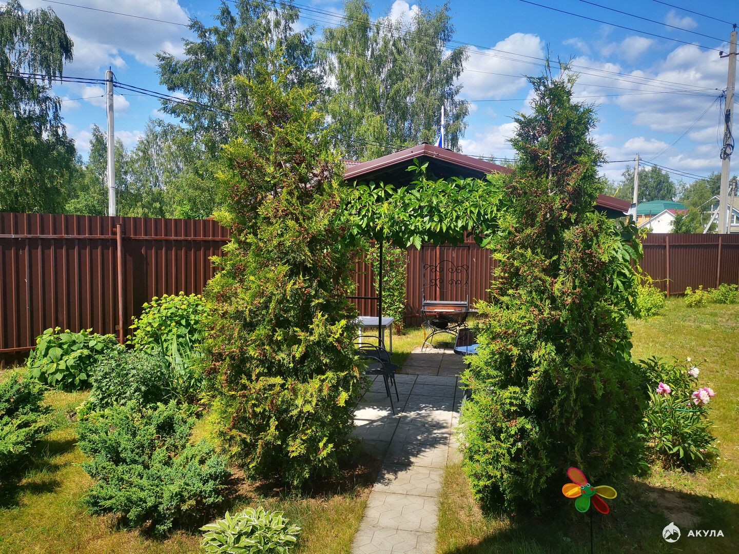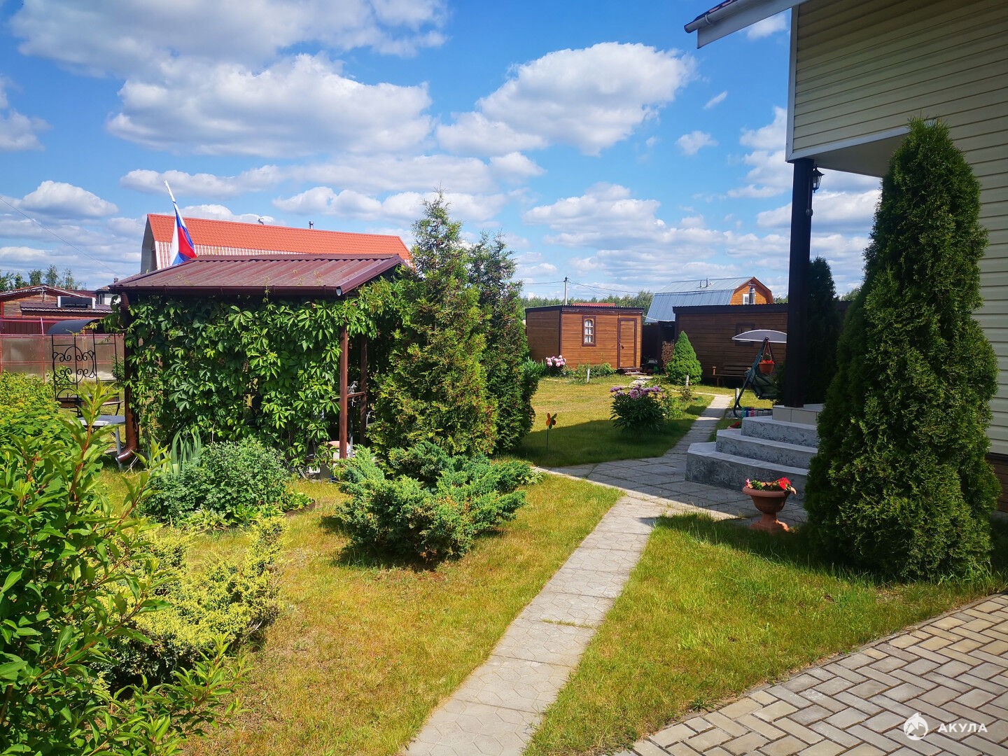 Во дворе растут цветы и красивые декоративные растения.