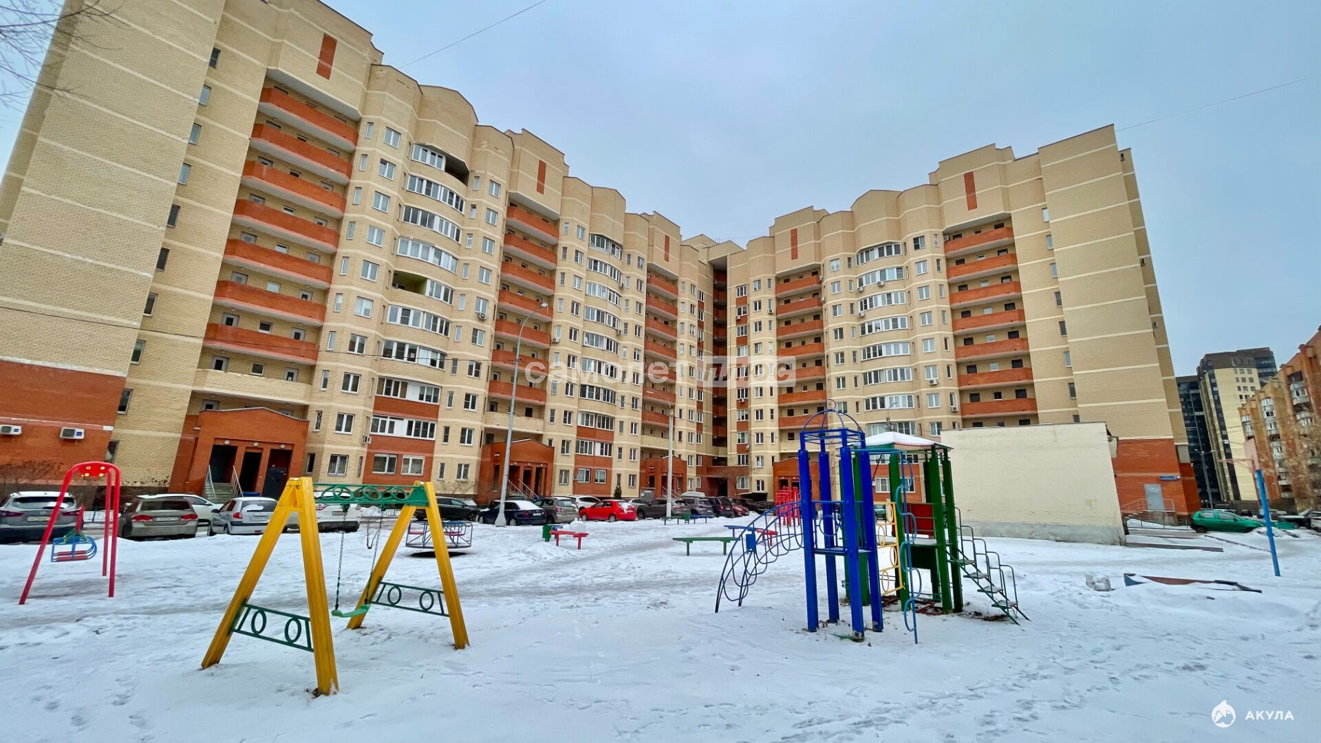 Новая современная детская площадка и организованная парковка около дома.