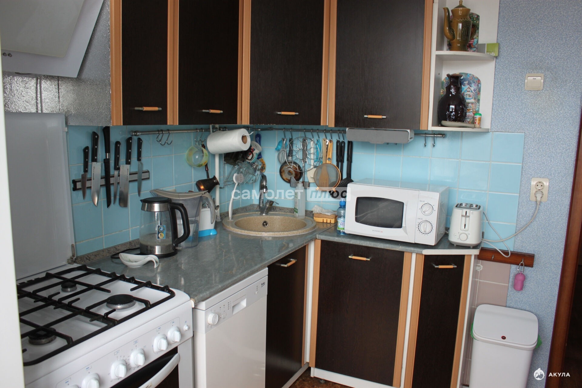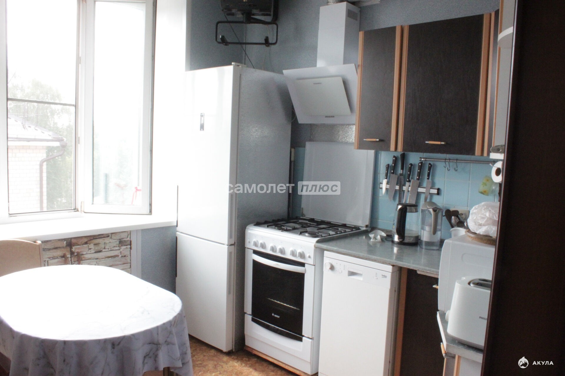 На кухне, в коридоре, в двух спальнях - на полу износостойкие ламинат и линолеум с гидроизоляцией.