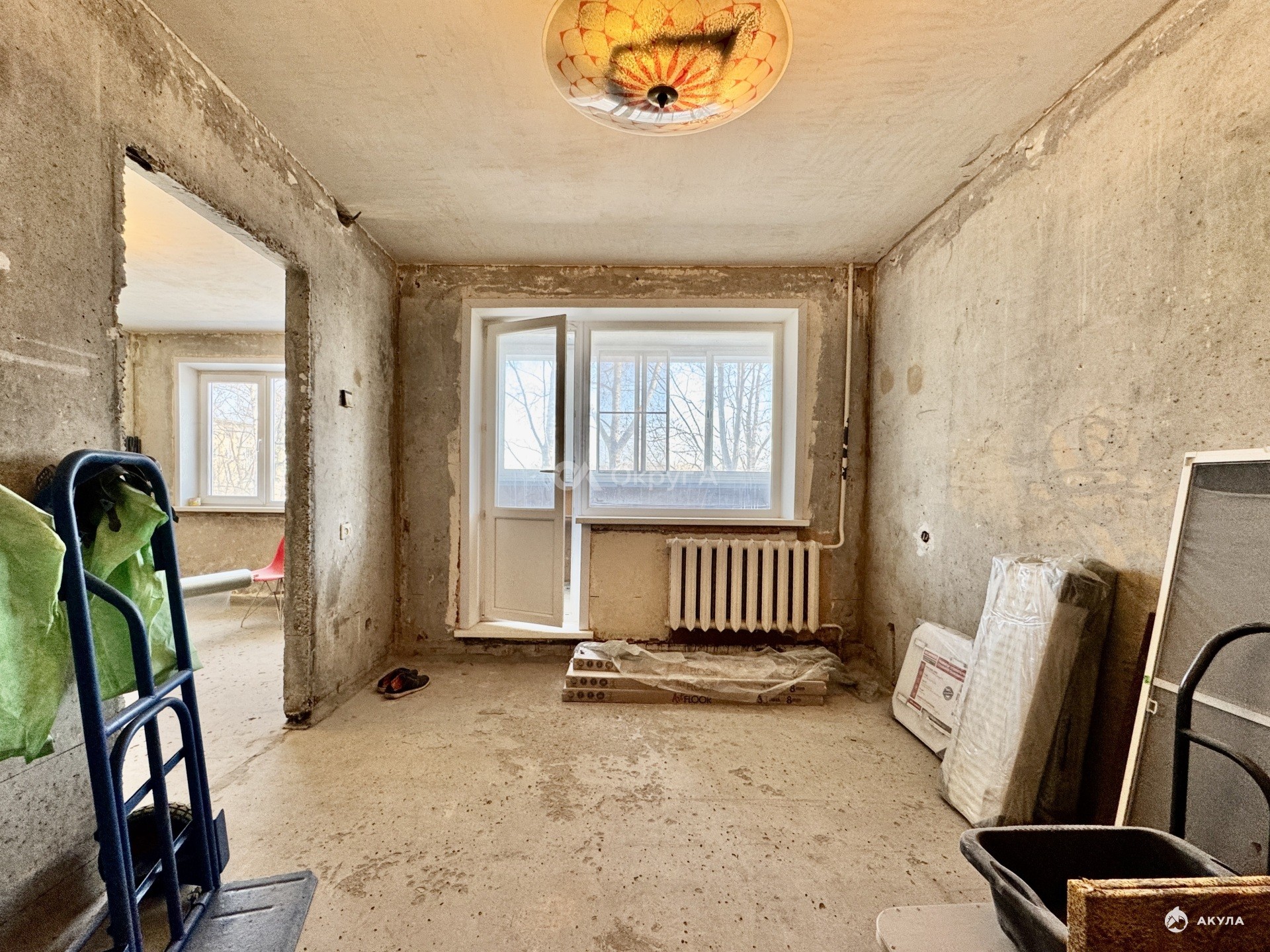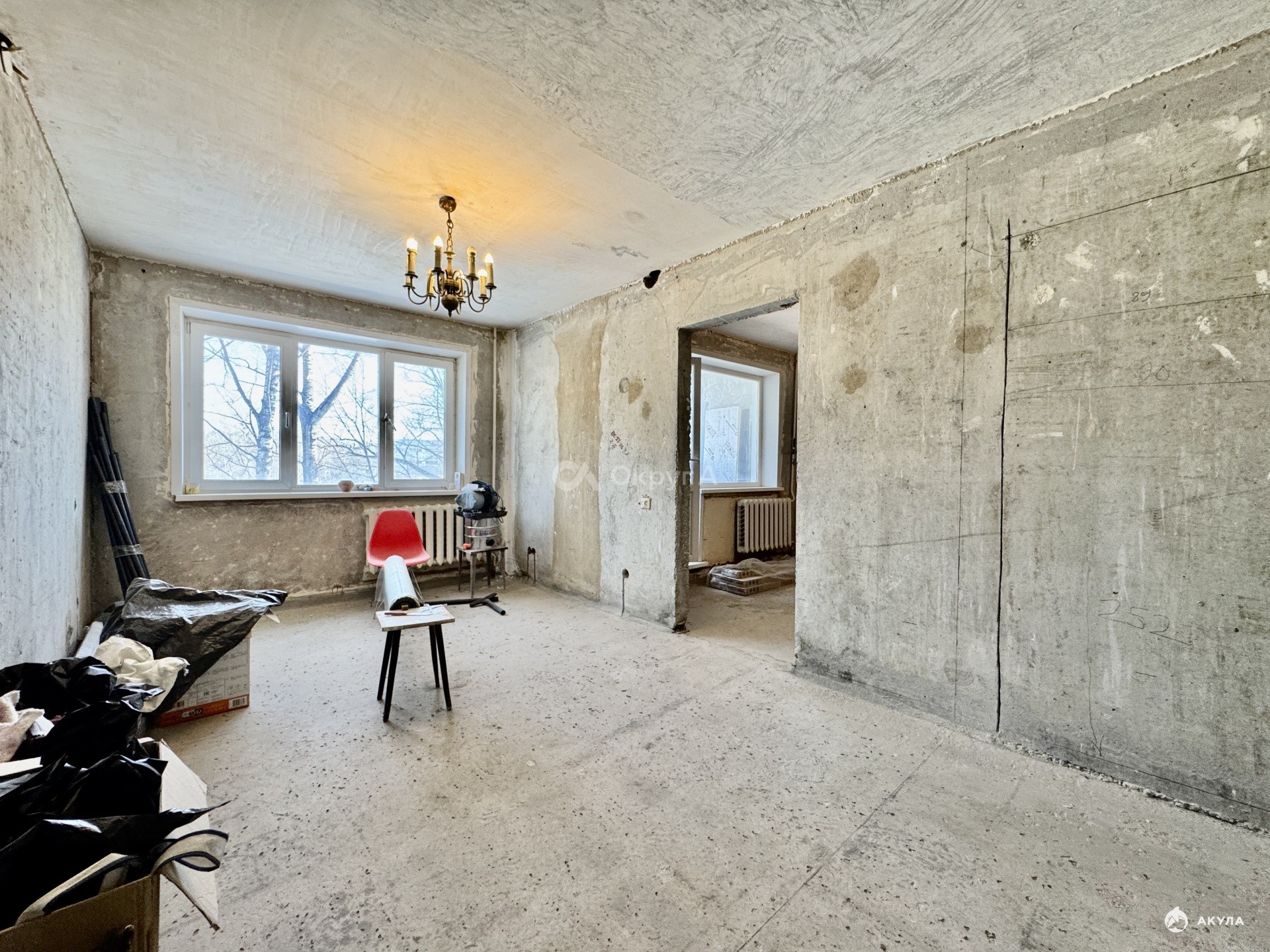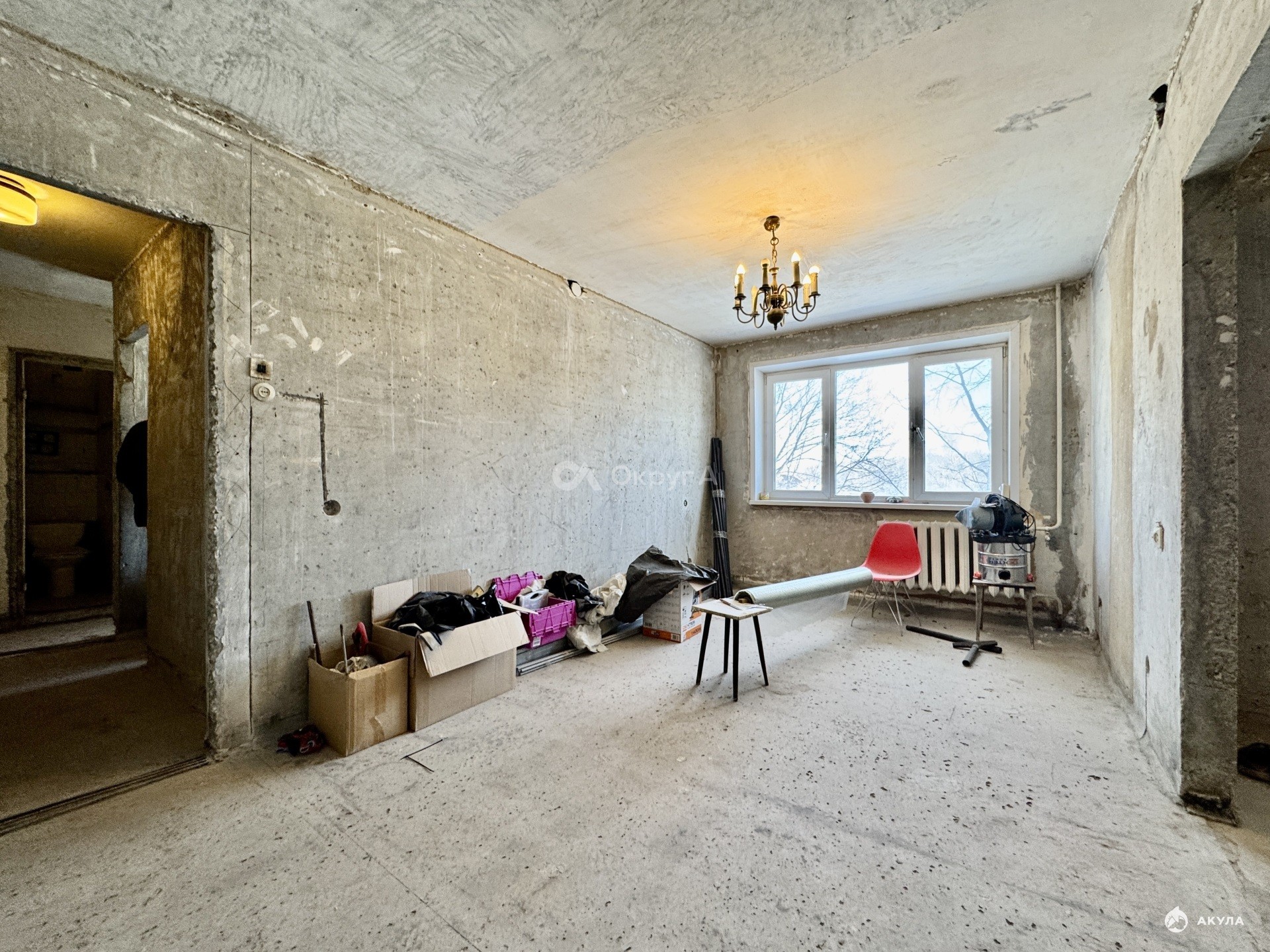 Квартира уже подготовлена к началу ремонта, что значительно экономит время и деньги. Полностью сняты старые покрытия со стен — удалены несколько слоёв обоев, краска и шпатлёвка, стены очищены до бетона. Демонтирован старый деревянный пол, благодаря чему можно сразу приступить к качественной стяжке, замене электропроводки и грамотному размещению розеток, выключателей и интернет-точек именно там, где это будет удобно.
