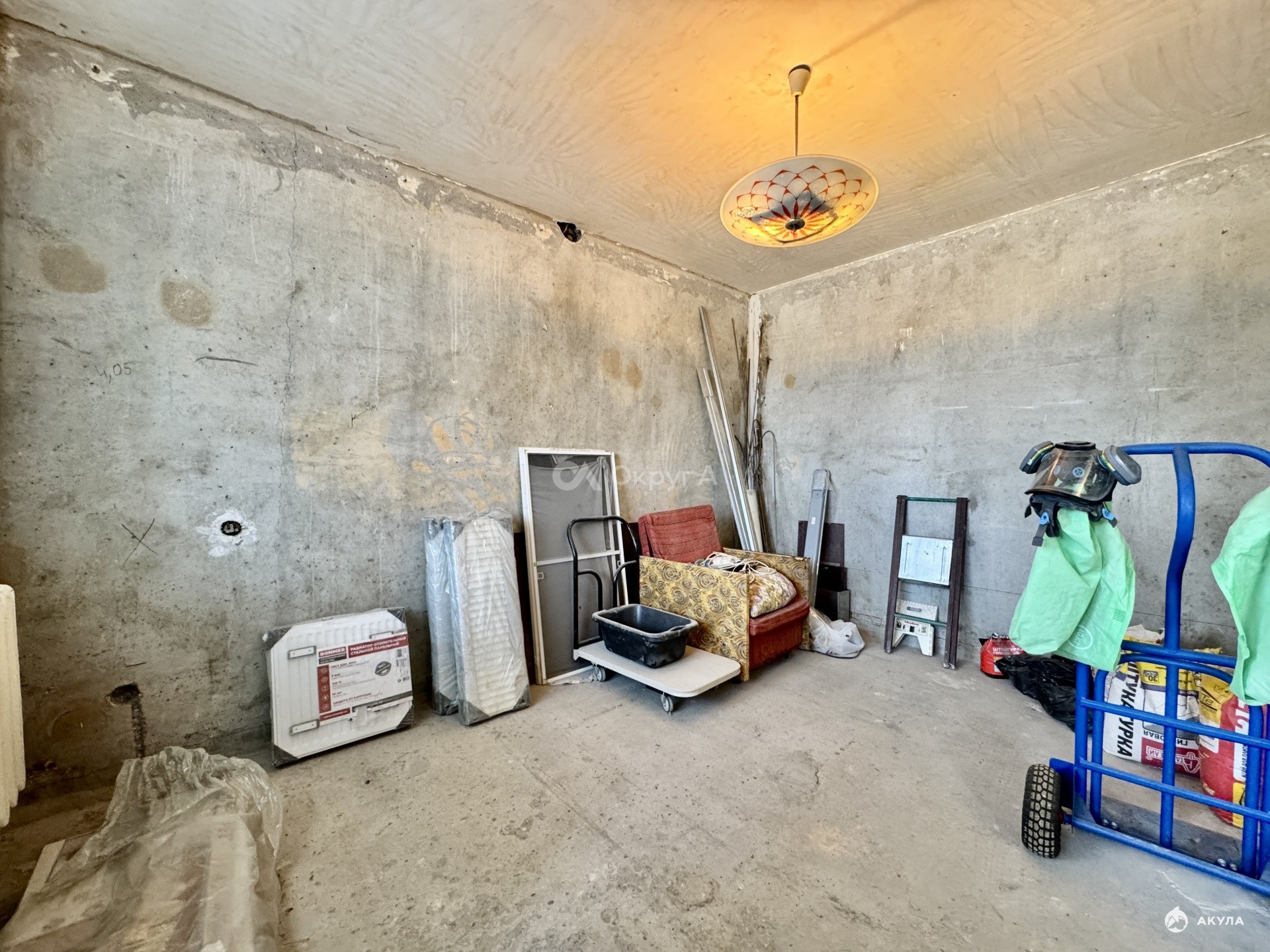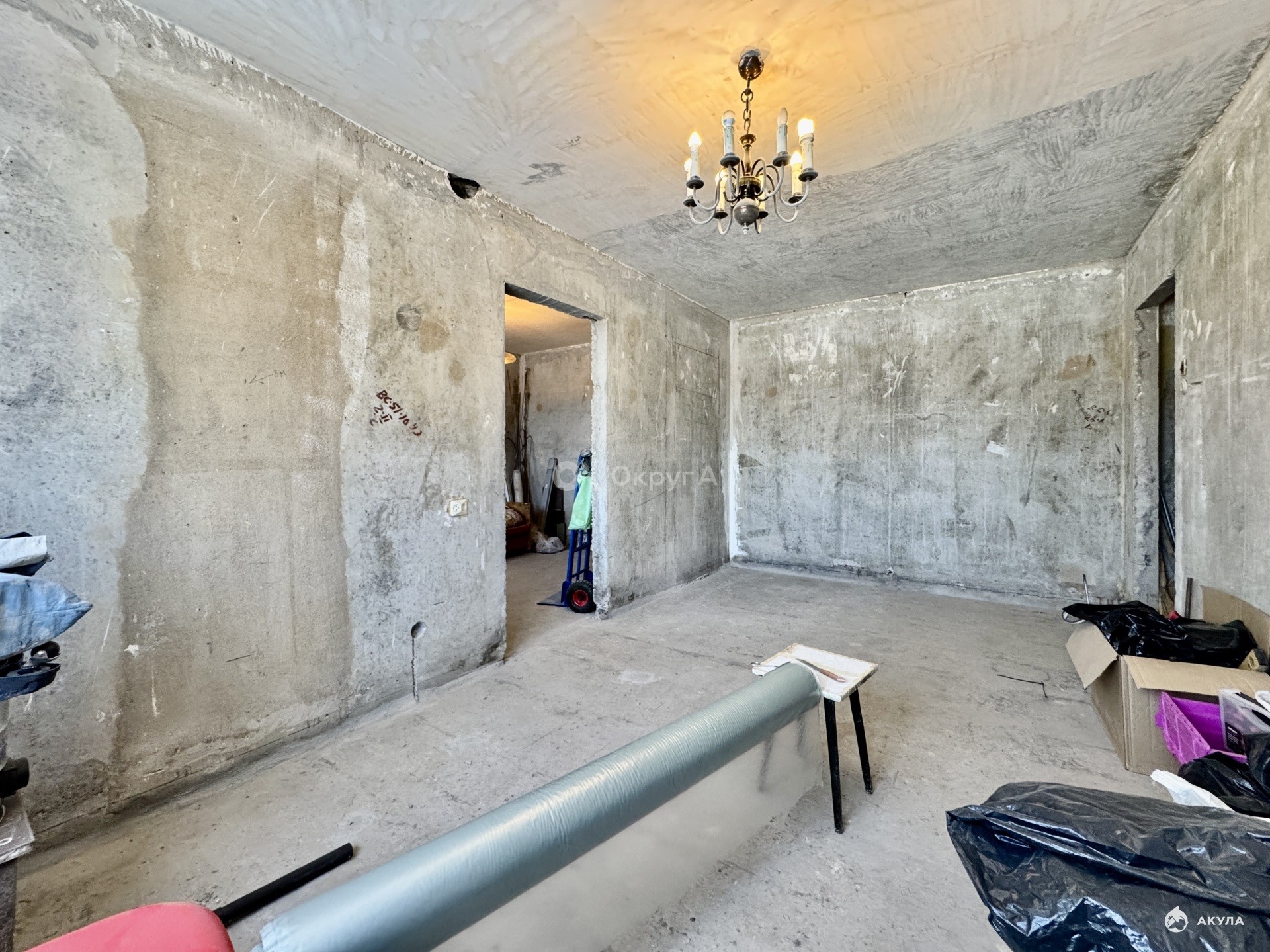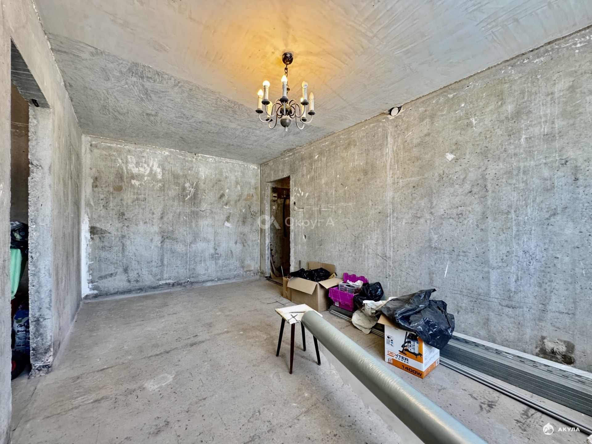 Квартира уже подготовлена к началу ремонта, что значительно экономит время и деньги. Полностью сняты старые покрытия со стен — удалены несколько слоёв обоев, краска и шпатлёвка, стены очищены до бетона. Демонтирован старый деревянный пол, благодаря чему можно сразу приступить к качественной стяжке, замене электропроводки и грамотному размещению розеток, выключателей и интернет-точек именно там, где это будет удобно.