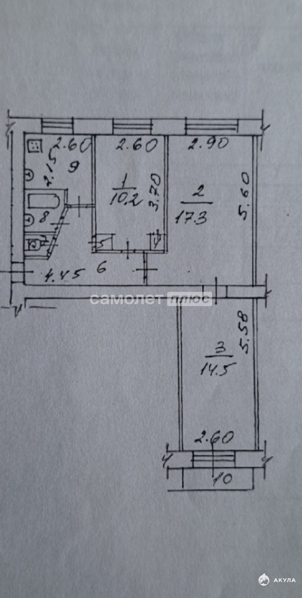 Квартира не угловая, окна выходят во двор( на восток) и на улицу (запад). Комнаты смежно-изолированные (10, 2м , 17, 3м и 14, 5м) , с балконом (не застеклен). Требует ремонта.