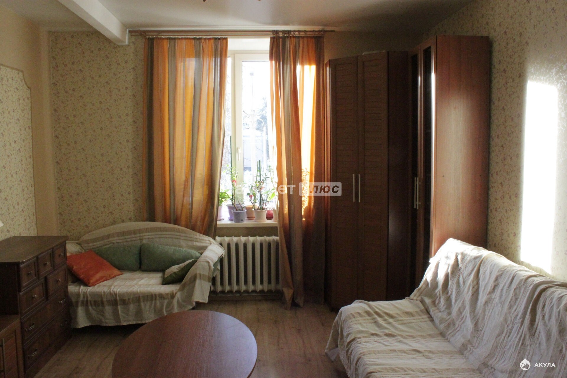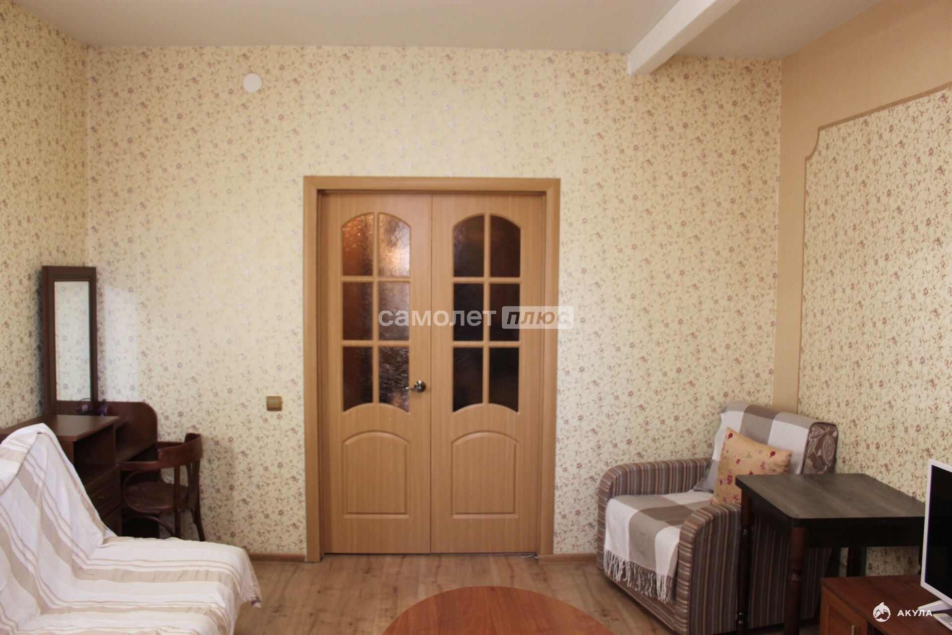 Качественная мебель: диван раскладной 2-спальный, диван для отдыха, кресло, стол в гостиной, шкаф для одежды, стол с зеркалом для макияжа, шкаф для одежды в прихожей, стол на кухне, стулья, кухонный гарнитур.